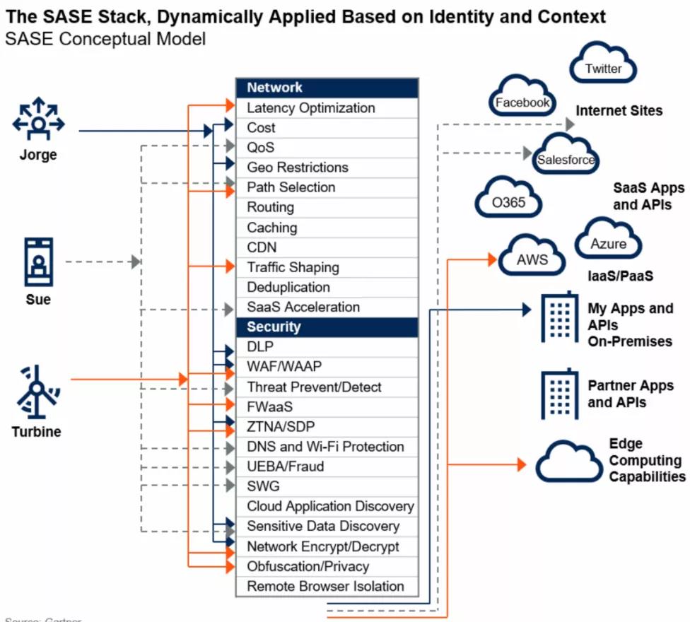 Gartner对SASE的定义也很简单:SASE是一种基于实体的身份、实时上下文、企业安全/合规策略,以及在整个会话中持续评估风险/信任的服务。实体的身份可与人员、人员组(分支办公室)、设备、应用、服务、物联网系统或边缘计算场地相关联。