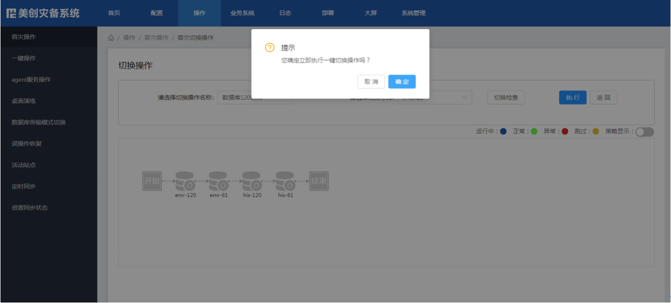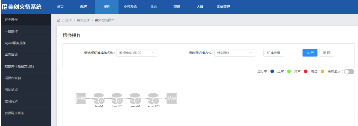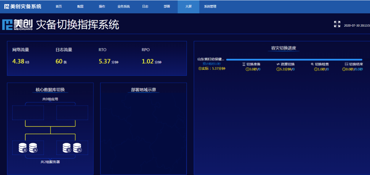随着“一键切换”操作,整个过程历时5分钟,生产系统顺利切换到容灾系统,数据同步正常。美创灾备切换指挥系统大屏展示切换过程: