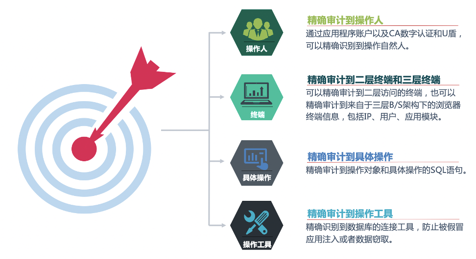 数据库审计作为数据库之外的第三方独立审计系统,以安全事件为中心,以全面审计和精确审计为基础。