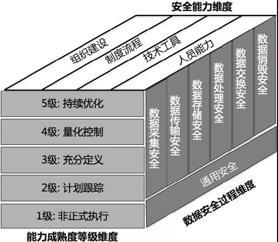 DSMM将数据按照其生命周期分阶段采用不同的能力评估等级,分为数据采集安全、数据传输安全、数据存储安全、数据处理安全、数据交换安全、数据销毁安全六个阶段。DSMM从组织建设、制度流程、技术工具、人员能力四个安全能力维度的建设进行综合考量。DSMM将数据安全成熟度划分成了1-5个等级,依次为非正式执行级、计划跟踪级、充分定义级、量化控制级、持续优化级,形成一个三维立体模型,全方面对数据安全进行能力建设。