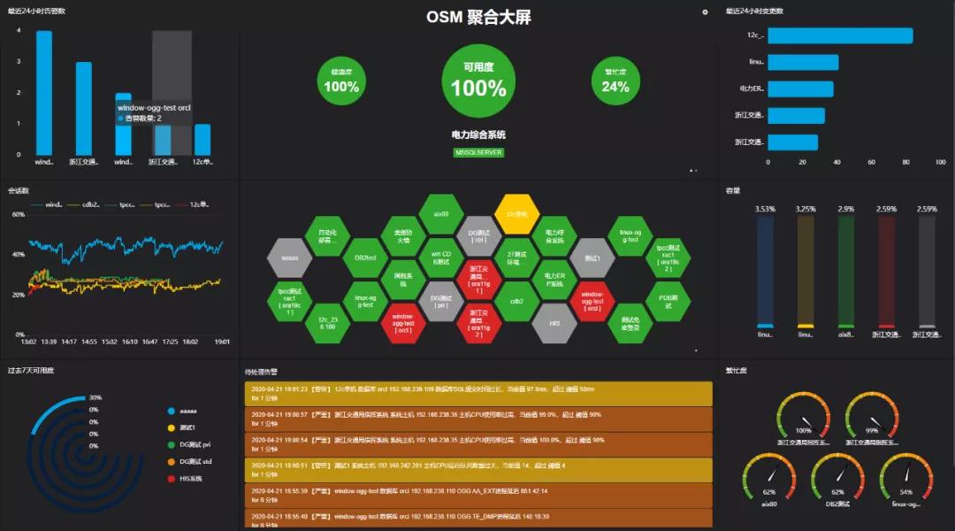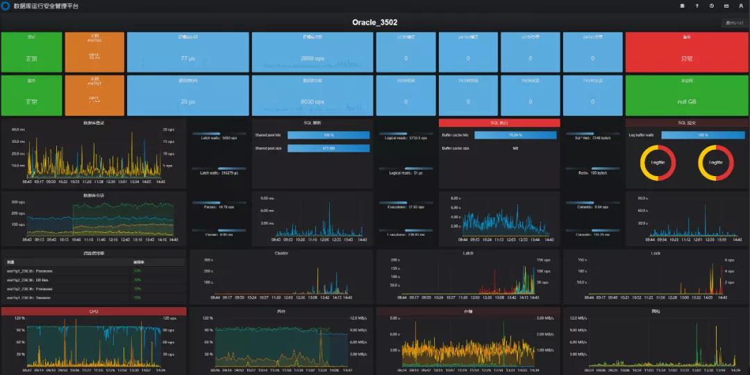 数据库运行安全管理平台通过对数据库资产的的聚合监控及单一精细化监控,7*24小时实时监测数据库资产的运行安全和性能稳定性。聚合监控从最近24小时告警数量、最近24小时变更数量、过去7天可用性、会话数、繁忙度、容量等多个维度,实现全面、丰富、深度地数据库聚合监控。利用聚合监控大屏,运维人员可以直观清晰地了解到各数据库对象及其对应的业务系统整体运行情况,确保业务系统的连续稳定可用。