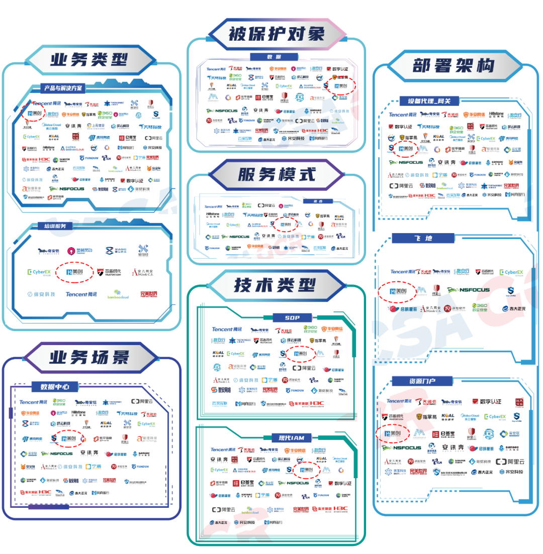 《2020中国零信任全景图》以基本流程为主线,并从被保护对象、业务场景、业务类型、技术类型、服务模式、部署架构六方面对相关代表厂商进行分类汇总。