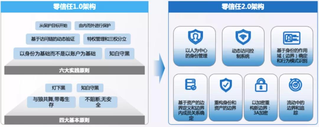 ➢ 2010年,美创科技基于零信任理念,提出以"灯下黑"、"与狼共舞,带毒生存"、"不阻断,无安全"、"知白守黑"为核心的四大安全基本原则和六大实践原则。