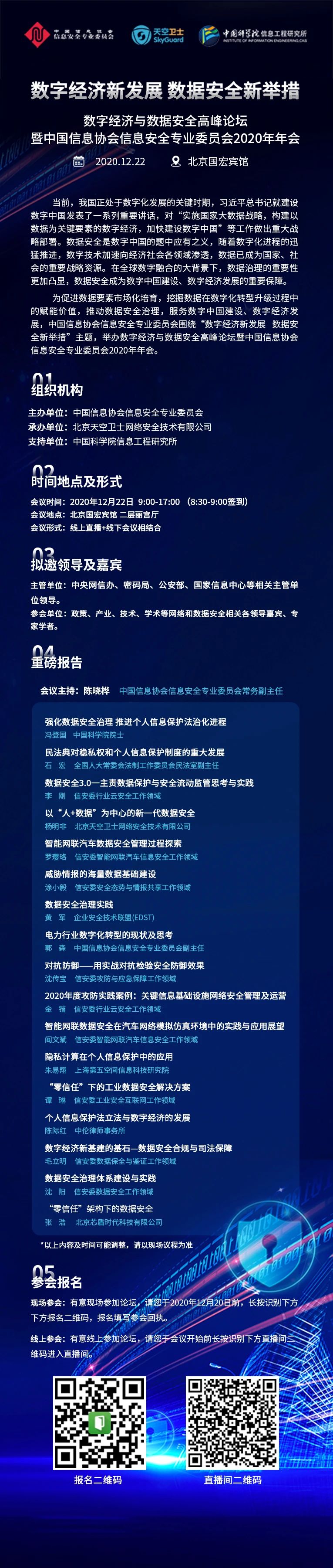 数据出境安全治理服务 数据安全能力评估认证服务 数据安全风险评估服务 数据安全治理咨询服务 数据分类分级咨询服务 个人信息风险评估服务 数据安全检查服务为促进数据要素市场化培育,挖掘数据在数字化转型升级过程中的赋能价值,推动数据安全治理,服务数字中国建设、数字经济发展,中国信息协会信息安全专业委员会联合北京天空卫士网络安全技术有限公司和中国科学院信息工程研究所以“数字经济新发展 数据安全新举措”为主题,于2020年12月22日在北京国宏宾馆举办数字经济与数据安全高峰论坛暨中国信息协会信息安全专业委员会2020年年会。