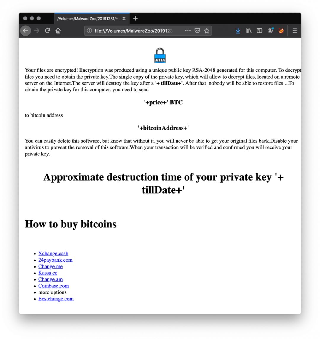 安全研究人员近日发现使用Node.js开发的勒索软件样本。该勒索软件的第一阶段为VBScript,没有被混淆,研究人员猜测其可能为勒索软件原型或者用于测试。Node.js加密是通过公用/专用密钥对执行,赎金价格为0.4 BTC,目前还未找到勒索信中提供联系的电子邮件地址,并且代码中加密的文件扩展名为空。