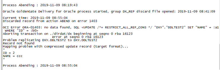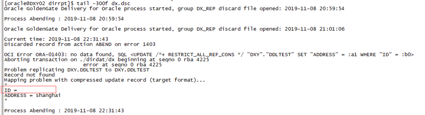 根据日志可以看到,ogg在执行sql语句时,发现需要去更新的记录不存在,具体sql语句和报错可以进一步查看discard文件(discard文件在ogg安装目录/dirrpt/路径下)
