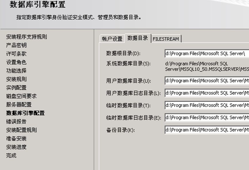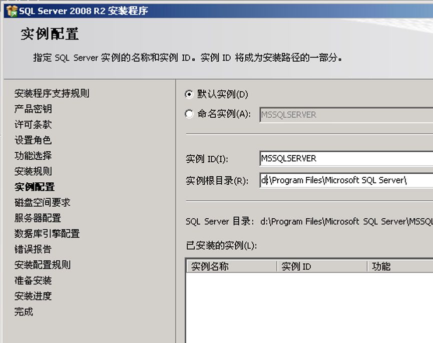 选择默认实例,实例根目录选择在D盘,这样意味着默认的备份文件,数据文件,日志都会放在D盘的相应目录。