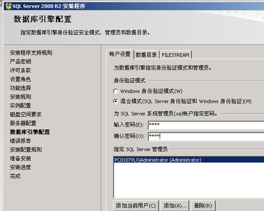 下一步,使用混合身份验证,SA的密码为test,添加当前计算机帐户Administrator为sysadmin的服务器角色。