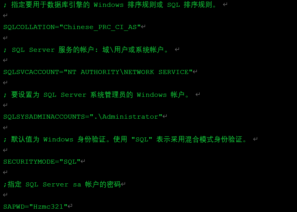 如果在命令行里指定了参数 /SAPWD="Hzmc321",而在配置文件里又指定了参数SAPWD="hzmc123",那么SQL Server只会将SA的密码设置为Hzmc321。