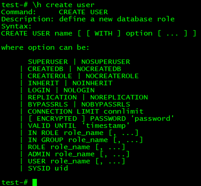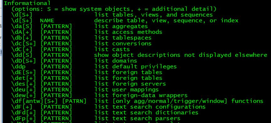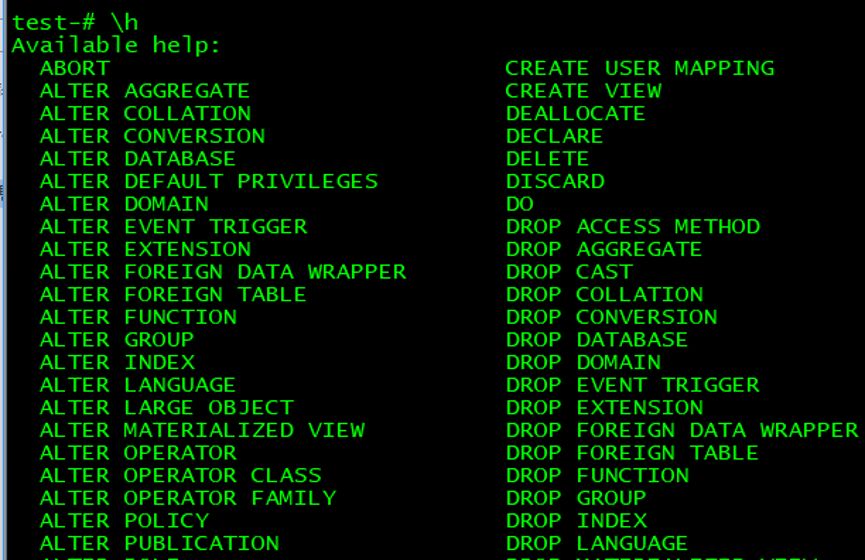 除了查询命令,psql连建立、修改对象的语法都可以直接看到,“h (命令)“。psql工具真的是使用者的“小棉袄”!