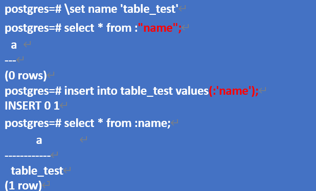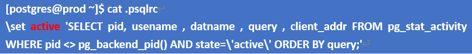 编辑 postgresql管理用户家目录下下的 .psqlrc文件。格式为 set 自定义名字 ‘查询内容’。