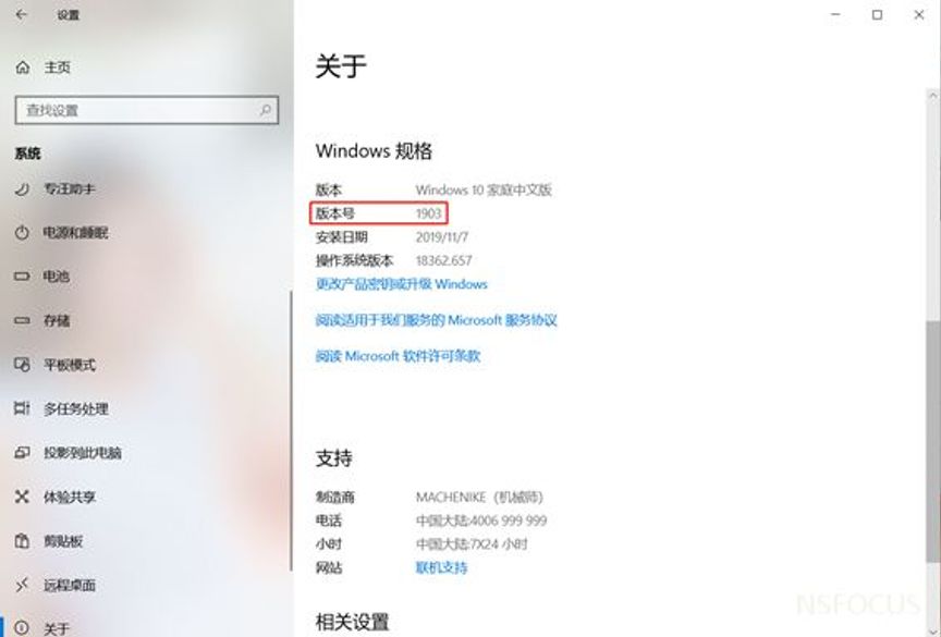 查看“Windows规格”中的“版本号”,如果版本号显示为1903或1909,则证明受此漏洞影响,建议立即安装补丁。
