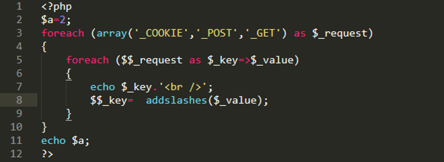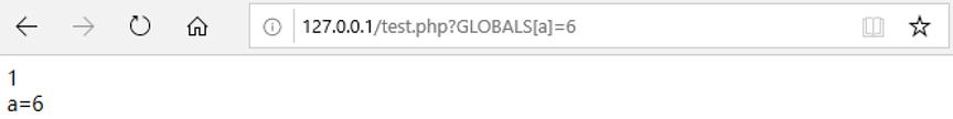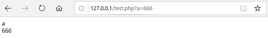从代码中我们可以看出$_key为COOKIE、POST、GET中的参数,$key的值为a而还有一个$在a的前面,结合起来则是$a=addslashes($_value);所以这样会覆盖已有的变量$a的值。在浏览器输入http://127.0.0.1/test.php?a=666,结果如下,可以看到已经成功把变量$a的值由2覆盖成了666。