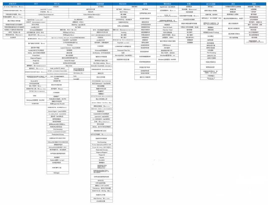 ② Enterprise:攻击时的部分已知技术手段,例如访问初始化、执行、常驻、提权、防御规避、访问凭证、发现、横向移动、收集、数据获取、命令和控制等。