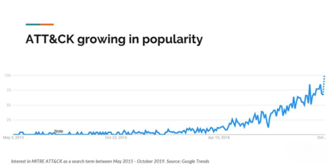 ATT&CK早在2014年提出以来就全世界的安全分析领域中如火如荼的发挥着影响,尤其是近两年的热度呈指数级增长,如下图所示。众所周知ATT&CK框架是从攻击战术和技术两方面来构建知识资源库的,而这也正好是安全分析中研究的重点。但是在安全分析中一直存在着两大难题:上下文检测以及统一标准的缺失。