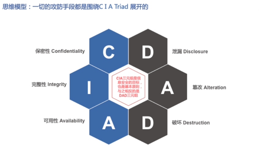 我们先来看一个比较简单的思维模型,CIA Triad原则就是一切的攻防手段都是围绕着保密性(C)、完整性(I)、可用性(A)三原则展开的。