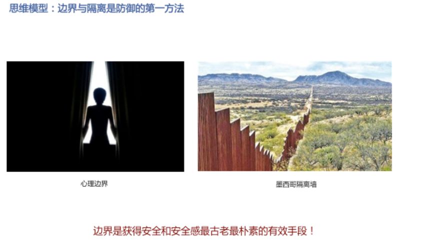 与美国边界的隔离墙。无论是我们所说远古的长城还是到现在的墨西哥和美国边境之间的隔离墙,边界和隔离都是非常有效的一种最古老、最朴素的技术手段,到现在还在运用。划定边界,以界隔离,大道至简。接下来看一个相对来说比较复杂的一个事情。用安全思维模型来分析它,是否可以帮助我们更清楚地去看明白?