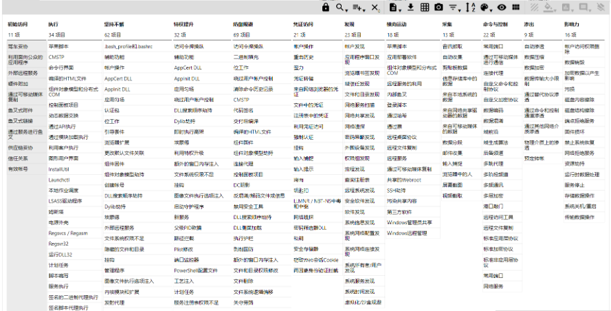 ATT&CK战术按照逻辑分布在多个矩阵中,以“初始访问”战术开始,经过“执行”、“持久化”、“提权”、“防御绕过”、“凭据访问”、“发现”、“横向移动”、“收集”、“命令与控制”、“数据泄露“、”影响“等共计12项战术。每项战术下有着数量不同的技术存在,而且每种技术都有唯一的ID号码,例如“初始访问”下的“鱼叉式链接“技术ID为T1192。