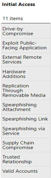 首先是初始访问战术,尽管ATT&CK并不是按照任何线性顺序排列的,但初始访问是攻击者在企业环境中的立足点。对于企业来说,该战术是从PRE-ATT&CK到ATT&CK的理想过渡点。攻击者会使用不同技术来实现初始访问技术。
