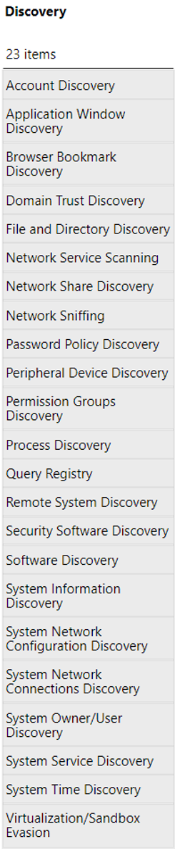 “发现”战术可以说是整个ATT&CK框架中最难以防御的策略,可以说是“防不胜防啊”。其实“发现”战术与上一篇简单提到过的洛克希德·马丁网络Kill Chain的侦查阶段有很多相似之处。组织机构要正常运营业务,肯定会暴露某些特定方面的内容。