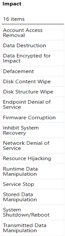 “影响”是ATT&CK最后一项战术,攻击者试图操纵、中断或破坏企业的系统和数据。用于影响的技术包括破坏或篡改数据。在某些情况下,业务流程可能看起来很好,但可能已经更改为有利于对手的目标。这些技术可能被对手用来完成他们的最终目标,或者为机密泄露提供掩护。