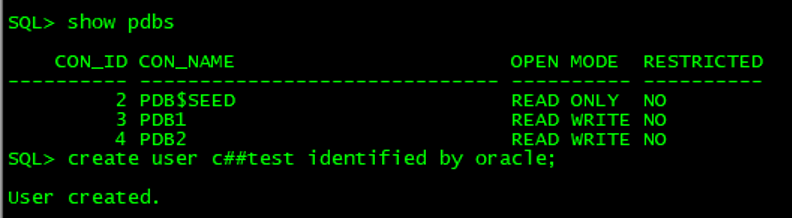 自己创建的CDB公共用户的用户名必须以C##或c##开头。每个CDB公共用户可以在不同的PDB中拥有不同的权限,例如创建一个用户c##test,只赋予它连接PDB1的权限而不赋予连接PDB2的权限。