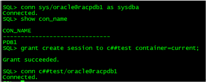 刚创建好的c##test要有create session权限才能连接PDB,下面的例子是单独赋予PDB1的create session,这样的话c##test只能连接PDB1,而不能连接其他PDB。