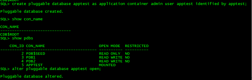 在创建Application容器的同时,创建Application公共用户apptest,与CDB公共用户不同的是用户名不需要c##开头。