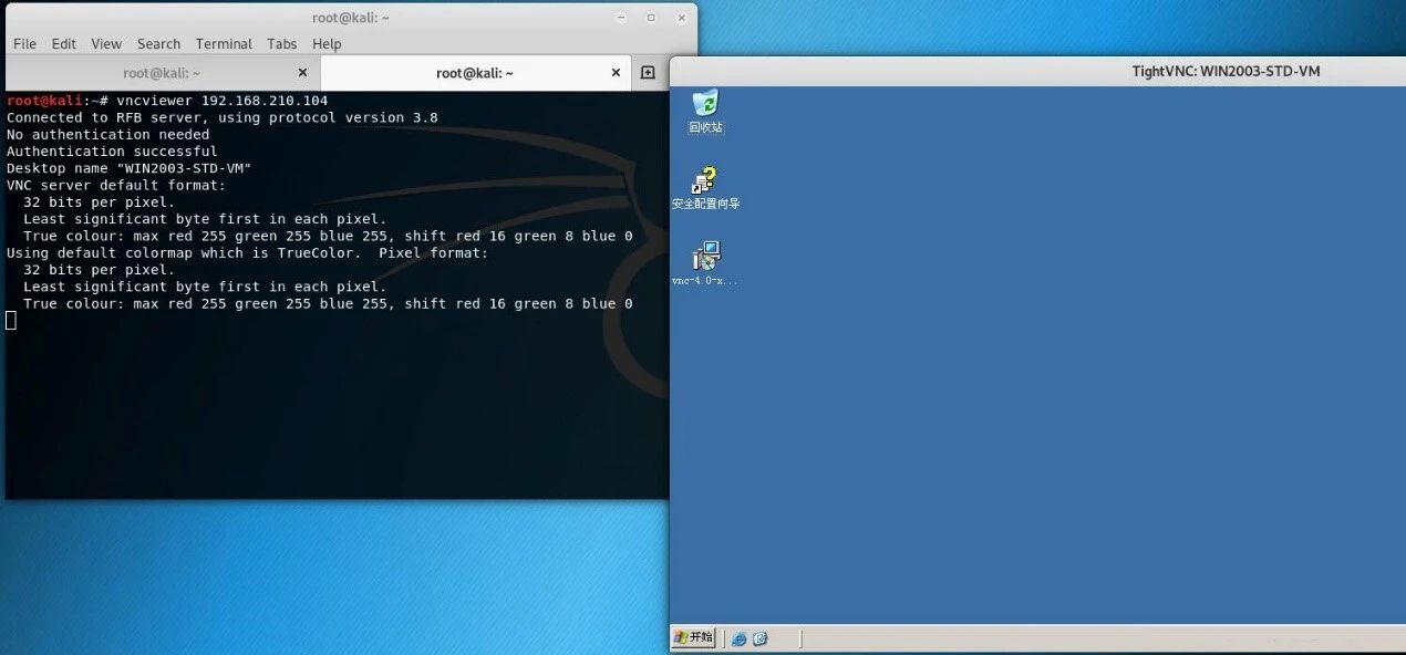 攻击机:192.168.210.38(Kali)目标机:192.168.210.104(Windows Server 2003)服务版本:VNC 3.8 攻击机无需输入用户名与密码即可连接到目标机开放的VNC server中。