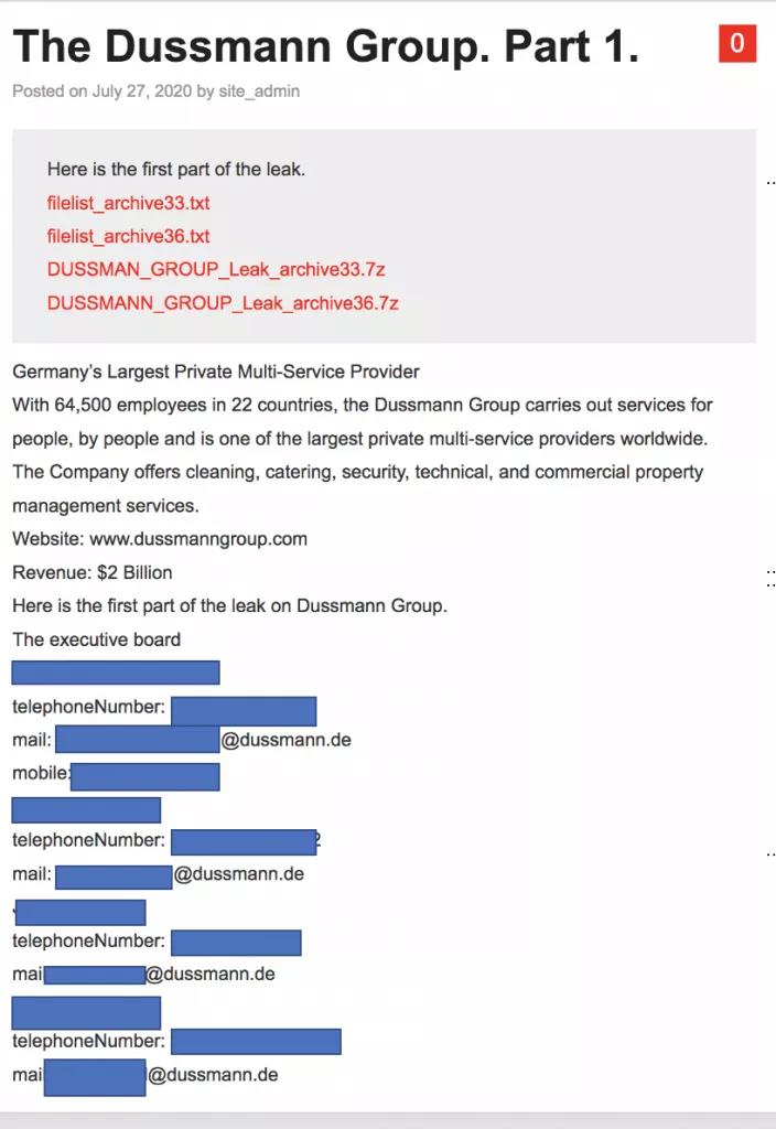 Nefilim勒索软件操控者攻击了德国最大的私人多服务提供商Dussmann集团并在暗网泄露该公司数据。泄露的第一批数据为15.7GB,其中包括公司的索赔和解文件、强制担保抵押文件、法律合同、合作和项目协议等。Nefilim勒索软件操控者共泄露了16805个该集团文件。