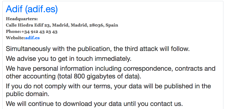 REvil勒索软件犯罪团伙攻击了基础设施管理局(ADIF)。ADIF是西班牙的国有铁路基础设施管理机构,管理着大量的轨道、车站、货运站以及最重要的铁路交通。该团伙已经针对ADIF进行了两次攻击,发布包括合同、通讯、文件、财产记录等记录以示警告,并表示如果不支付赎金,将发起第三次攻击。