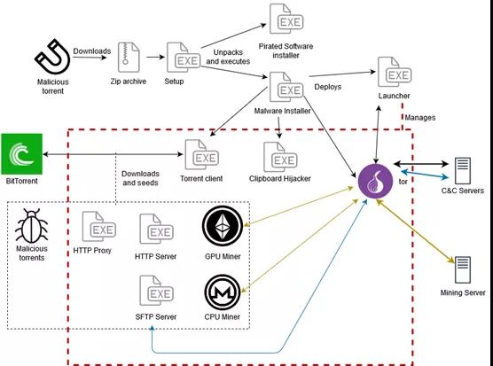 威胁研究人员发现了一个新的恶意软件,它专注于从受害者那里获取尽可能多的加密货币。这款名为KryptoCibule的恶意软件已经躲过了近两年的监视,它在每一个新版本中都扩展了自己的功能。研究人员指出,KryptoCibule严重依赖Tor网络来与它的命令和控制服务器进行通信。它通过伪装成流行软件和游戏盗版安装程序的恶意种子传播。当启动可执行文件时,恶意软件安装将在后台启动,破解产品的预期例程在前台运行。KryptoCibule还为Monero和Ethereum部署了同时使用CPU和GPU资源的矿工。