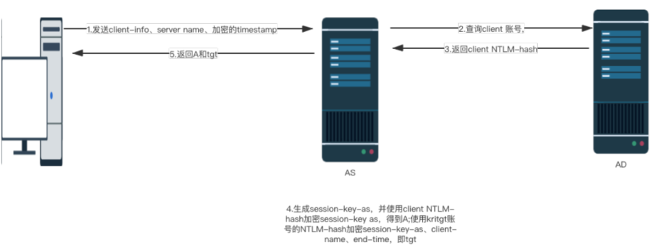 2)AS在接收到这串数据之后,会从中寻找到未被加密过的client-name,然后将client-name发送给AD。(发送给AD的原因是,AD存储着所有用户的NTLM-hash)