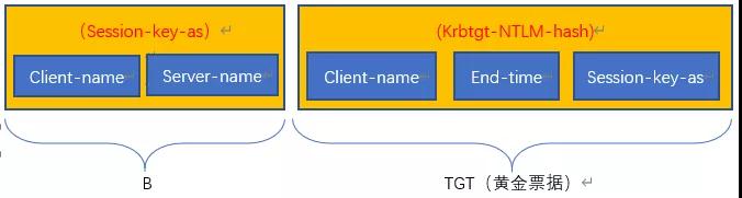 5)若AS成功验证了Client的身份,AS随机生成一个session-key-as,又称logon-session-key,使用已经被验证为正确的client-NTLM-hash加密session-key-as,得到的数据我们称为A,除此之外再利用krbtgt-NTLM-hash(KDC的一个特定账户krbtgt的NTLM-hash值)对client-name、end-time(TGT的到期时间)、session-key-as加密生成TGT,并将A和TGT返回给Client,至此第一阶段完毕。