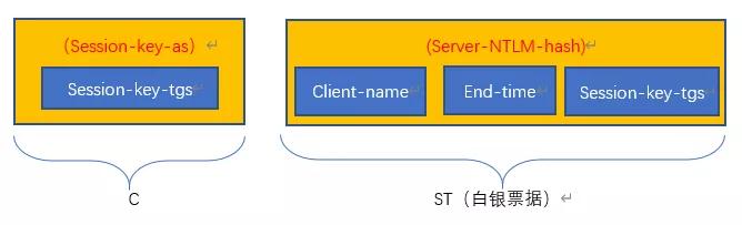 3)TGS接收到客户端发过来的B和TGT之后,利用本地存储的Krbtgt-NTLM-hash解密TGT,得到了client-name、end-time、session-key-as,再利用得到的session-key-as解密B,又得到了一个client-name,然后TGS比较两个client-name的值是否一致且合法,当前时间是否超过了end-time(确认是否过了有效期),如果一切都满足规定,TGS则生成一个新的随机密钥Session-key-tgs,然后使用session-key-as加密session-key-tgs得到C,利用server-NTLM-hash加密session-key-tgs、end-time、client-name得到ST。这里的Server-NTLM-hash指的是客户端想要与之建立连接的服务端的本地密码hash值。End-time指的是ST的过期时间。