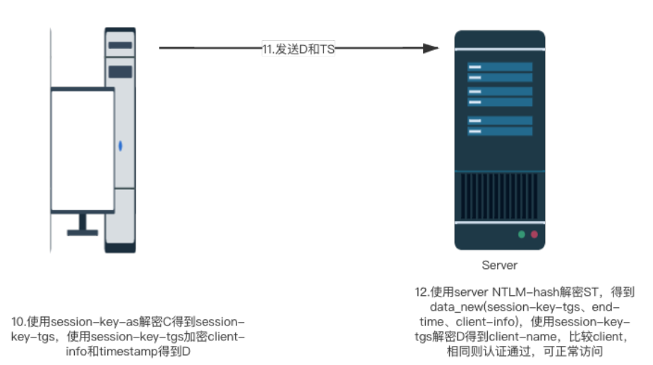 3)Server接收到来自客户端的D和ST,利用本地存储的Server-NTLM-hash对ST进行解密,得到client-name、end-time、session-key-tgs,然后再利用新的得到的session-key-tgs解密D,得到另一个client-name,然后比较两个client-name的值是否相同,是否超过了end-time的时效,如果都满足规定则验证通过,允许client访问Server上的资源。