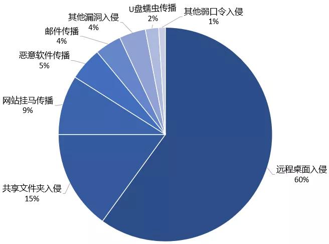下图为勒索病毒传播的各种方式的占比情况。可以看出勒索病毒的主要攻击方式依然以远程桌面入侵为主,其次为通过海量的垃圾邮件传播,或利用网站挂马和高危漏洞等方式传播,整体攻击方式呈现多元化的特征。