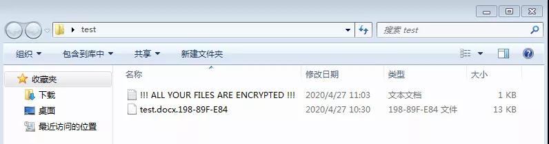 无诺亚防勒索防护的情况下:在test目录下,添加以下文件,若服务器中了勒索病毒,该文件被加密,增加“.198-89F-E84”加密后缀,并且无法正常打开。