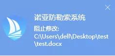 开启诺亚防勒索的情况下:双击执行病毒文件,当勒索病毒尝试加密被保护文件,即test目录下的文件时,诺亚防勒索提出警告并拦截该行为。
