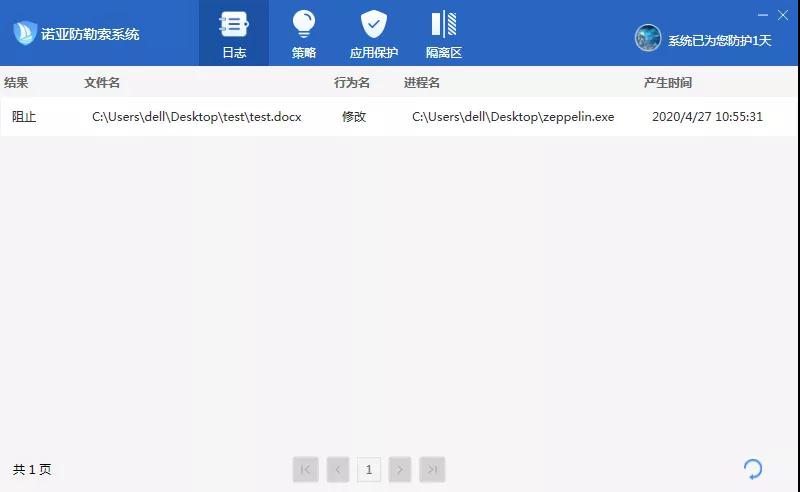为了更好的应对已知或未知勒索病毒的威胁,美创通过对大量勒索病毒的分析,基于零信任、守白知黑原则,创造性的研究出针对勒索病毒的终端产品【诺亚防勒索系统】。诺亚防勒索在不关心漏洞传播方式的情况下,可防护任何已知或未知的勒索病毒。以下为诺亚防勒索针对这款勒索病毒的防护效果。