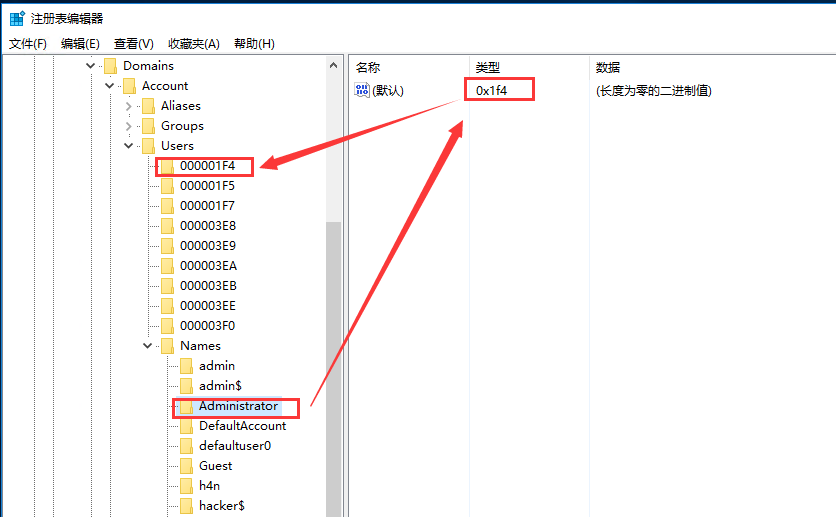其次前往SAM/Domains/Account/Users/Names处,选择Administrator用户,在右侧的键值处可以找到对应的值如0x1f4,然后从左侧的Users目录下可以找到对应的文件。