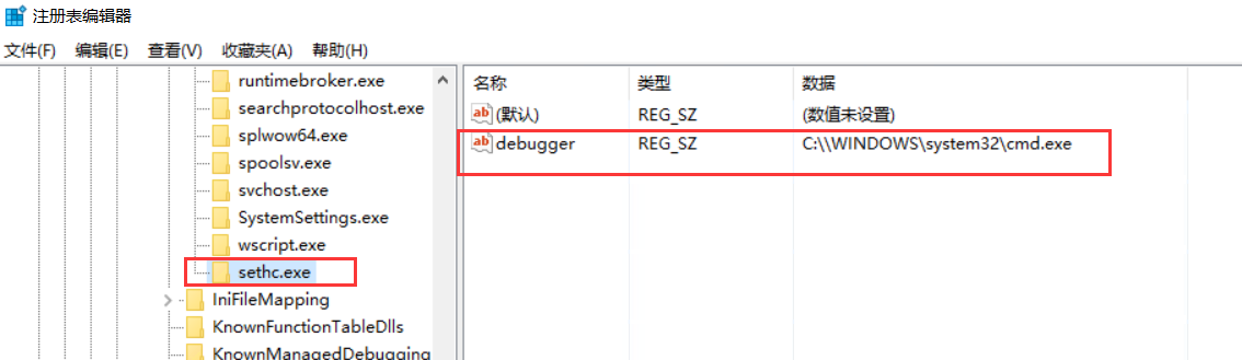 在目录中新建一个sethc.exe的子项,并添加一个新键debugger,debugger的对应键值为后门木马的路径,这里我用cmd路径代替一下。