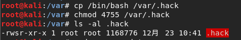 首先使用root权限创建一个suid权限的隐藏文件,这个文件是/bin/bash的复制文件。