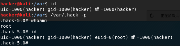 其次,使用普通用户登入系统,使用如下命令/var/.hack -p,执行该文件以获得一个root shell,执行后可以看到权限已经变成了root权限。