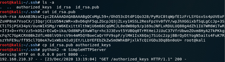 使用ssh-keygen生成两份文件,分别是id_rsa和id_rsa.pub前者是私钥文件,后者是公钥文件。使用某种方法,将攻击者生成的公钥文件id_rsa.pub上传进目标机~/.ssh/authorized_keys目录下即可。