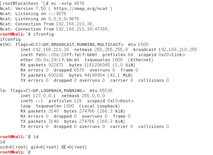 在攻击机上监听相应的端口,过了一分钟即可接收到来自目标机的反弹shell,实现权限维持。