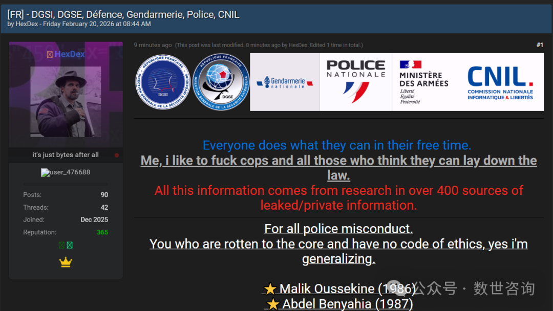 事件描述:2026.2.20某暗网数据交易平台有人发布法国执法部门相关泄露信息,发布者称数据来自400多个泄露及隐私数据源,针对警方不当行为,公布2393条法国政府特工完整信息,数据字段包括:姓名、出生日期、性别、国籍、状态、地址、电话、邮箱、执照信息、所属机构、缴费信息、医疗证明、许可日期等。